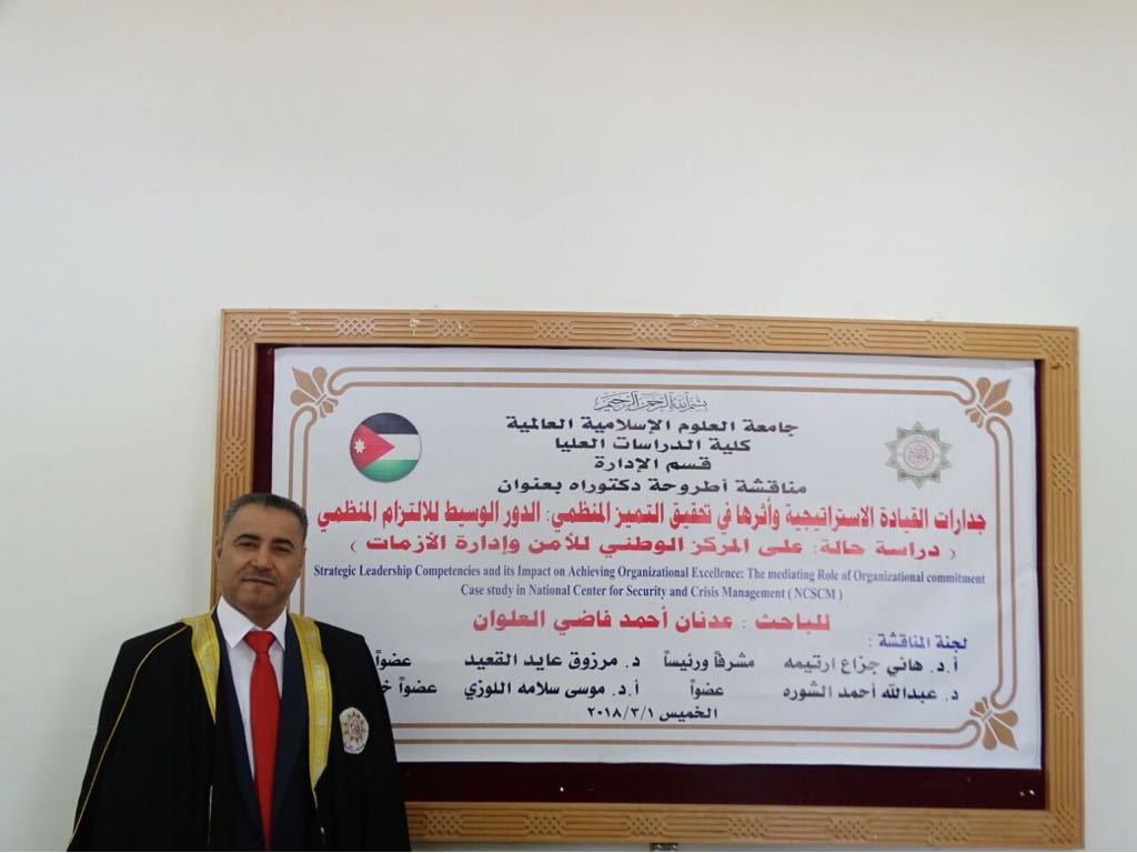 أسمى آيات التهنئة والتبريك للاخ العزيز الغالي العميد الركن عدنان احمد العبادي بحصولة على درجة الدكتوراه في جدارات القيادة الإستراتيجية وأثراها في تحقيق التميز المنظمي: الدور الوسيط للالتزام المنظمي من جامعةالعلوم الاسلامية العالمية .