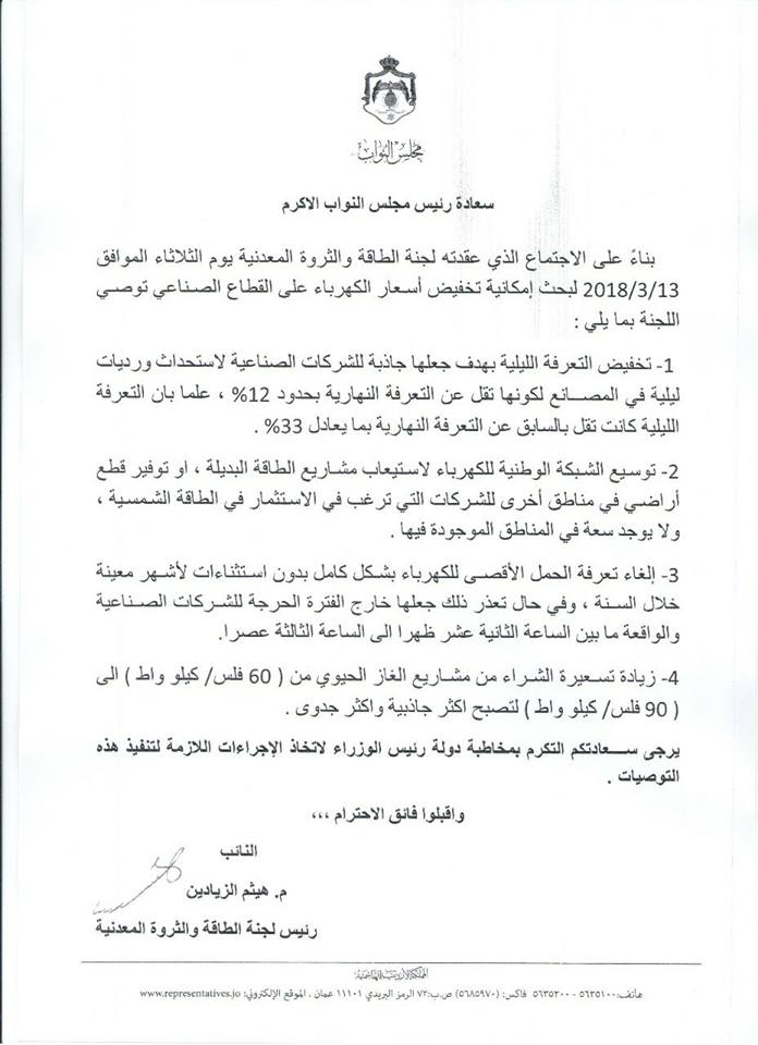 عمون - محمد الخوالدة - رفعت لجنة الطاقة والثروة المعدنية في مجلس النواب مذكرة لرئيس المجلس اقترحت فيها تخفيض اسعار الكهرباء على القطاع الصناعي.