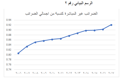 يظهر الرسم البياني رقم (1) الارتفاع المتصاعد لمجمل الضرائب كنسبة من الناتج المحلي الاجمالي خلال السنوات 2011-2016 وهي فترة حكومة عبدالله النسور. ومن الضروري أن يتركز الانتباه لملاحظة أن الضرائب غير المباشرة تتصاعد بوتيرة أسرع من مجمل الضرائب لتشكل في نهاية الفترة النسبة الاعلى من مكونات الضرائب. ومن الثابت في علم الاقتصاد أن الضرائب غير المباشرة هي ضرائب غير عادلة لانها تصيب الانفاق وليس الدخل. ولما كانت طبقة محدودي الدخل ينفقون كامل دخولهم أو اكثر، بينما الاغنياء ينفقون جزءا يسيرا من دخلهم ويوفرون معظمه، فإن العبء الضريبي على محدودي الدخل سيكون أعلى.