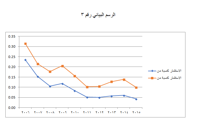 يظهر الرسم البياني التالي رقم (3) تطور الاستثمار في الاردن كنسبة من الناتج المحلي الاجمالي بالاسعار الثابتة والناتج المحلي الاجمالي بالاسعار الجارية. واصل الاستثمار إنخفاضه خلال السنوات الخمس التي حكمت فيها حكومة عبدالله النسور. وإذا ربطنا ما بين الرسمين السابقين والرسم البياني رقم (3) فانه يتضح أنه كلما زادت الضرائب كلما قل الحافز للاستثمار سواء الاستثمار المحلي او الاستثمار المستورد. وهذا بالضبط ما يقوله علم الاقتصاد. ويتناقل الاردنيون روايات كثيرة عن هروب نسبة عالية من المستثمرين، وصعوبة إستقطاب مستثمرين اجانب جدد. إن المتاجرة بشعار الامن والامان لم يعد ينطلي على أحد، بل واصبح مملا ومدعاة للتندر وكأن العالم كله فوضى وخراب وحروب، وان الاردن هو واحة الامان الوحيدة. إن صدى الاية: "ألم تكن ارض الله واسعة فتهاجروا اليها" لا بد وان يستمع اليه المستثمرون بل والسياح ايضا.