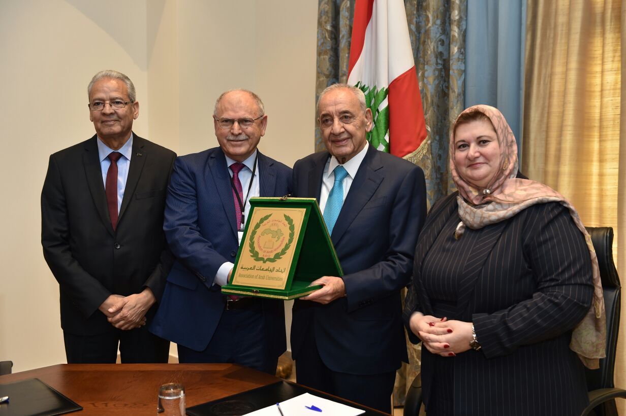 كما قدم د ابو عرابي درع اتحاد الجامعات العربية إلى الرئيس نبيه بري، والتقط “بري” عددا من الصور التذكارية مع أعضاء المجلس التنفيذي للاتحاد.