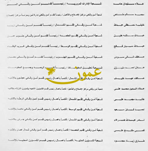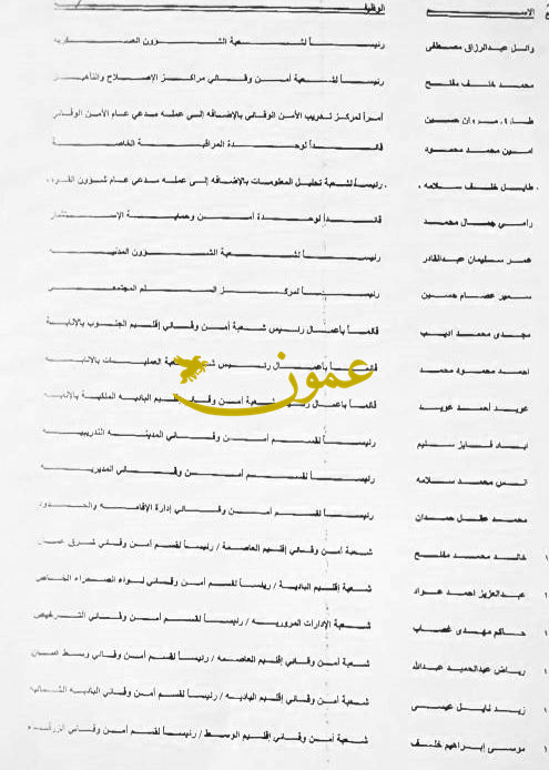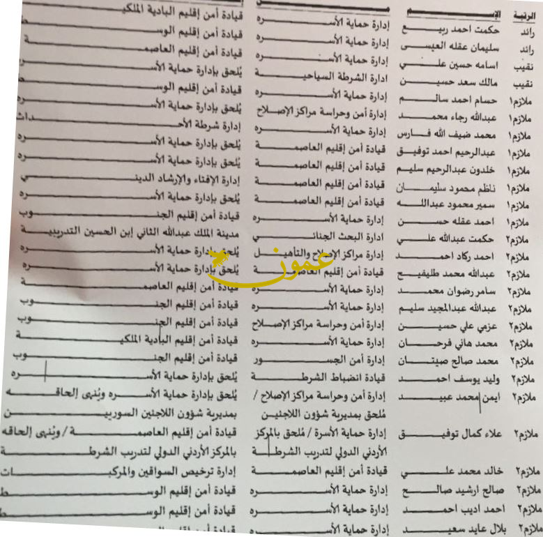 عمون - ينال المعاني - قرر مدير الامن العام اللواء فاضل الحمود اجراء تنقلات وتعينات في ادارة الامن الوقائي شملت تعيين 34 ضابطا رؤساء اقسام في الامن الوقائي داخل ادارت الامن العام على النحو التالي: