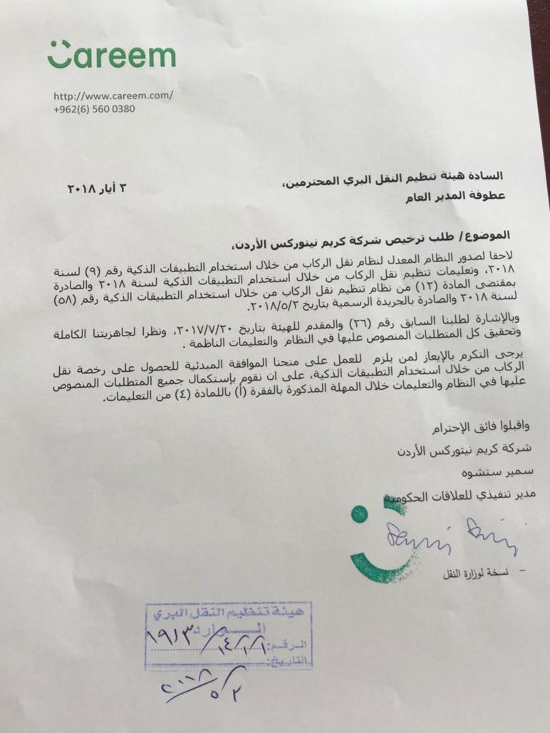 نعبر في شركة كريم عن سعادتنا بإصدار الحكومة الأردنية للنظام المعدل لنظام تنظيم نقل الركاب باستخدام التطبيقات الذكية، حيث ستصبح الشركات العاملة في تطبيقات النقل الذكية مرخصة رسمياً للعمل في الأردن.