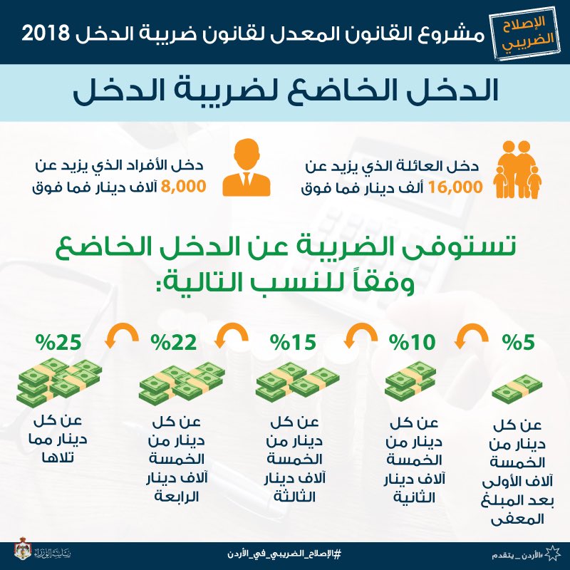 وكان مجلس الوزراء قد أقرّ الأسباب الموجِبة لمشروع القانون المعدِّل لقانون ضريبة الدّخل لسنة 2018، وعقد وزيرا الدّولة لشؤون الإعلام الدكتور محمّد المومني والماليّة عمر ملحس بعد ذلك مؤتمراً صحفيّاً في دار رئاسة الوزراء بحضور مدير عام ضريبة الدخل والمبيعات حسام أبوعلي للإعلان عن تفاصيل الأسباب الموجبة وبنود مشروع القانون.