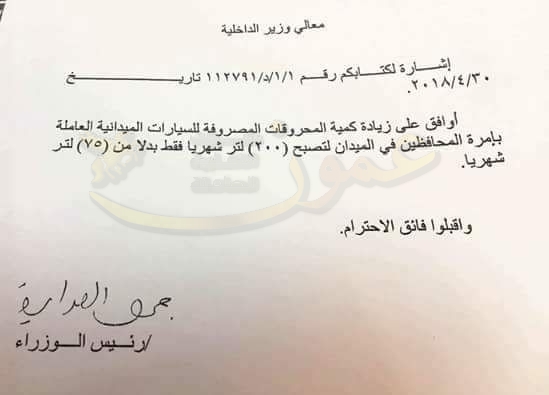 عمون - ينال المعاني - وافق رئيس الوزراء على زيادة كمية المحروقات المصروفة للسيارات الميدانية العاملة بأمرة المحافظين في الميدان لتصبح (200) لتر شهريا بدلا من (75) لتر شهريا. |
