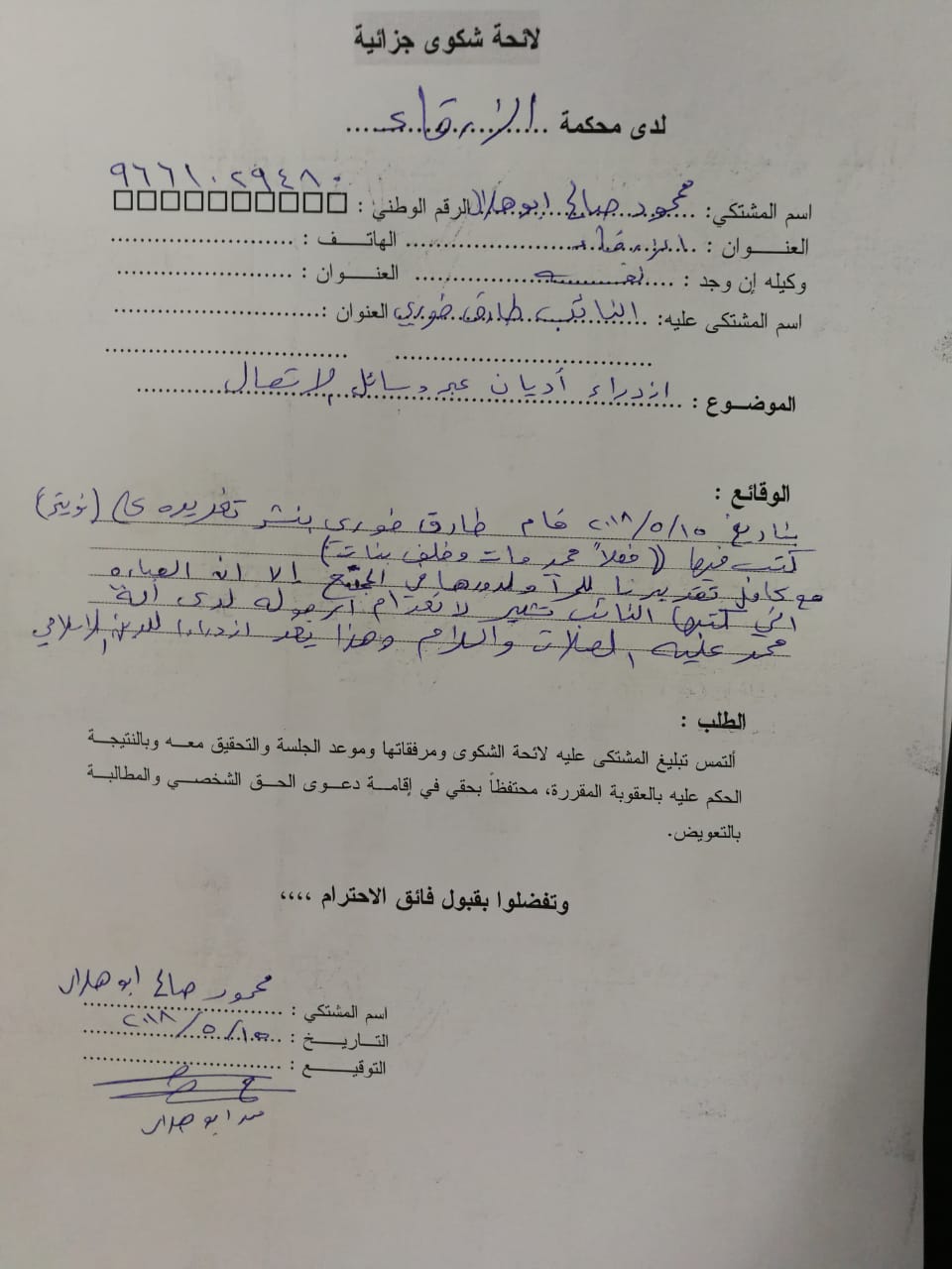 عمون - استقلبت محكمة الزرقاء اليوم شكوى بحق النائب طارق خوري بتهمة ازدراء أديان عبر وسائل الاتصال، قدمها الصحافي "محمود صالح ابو هلال".