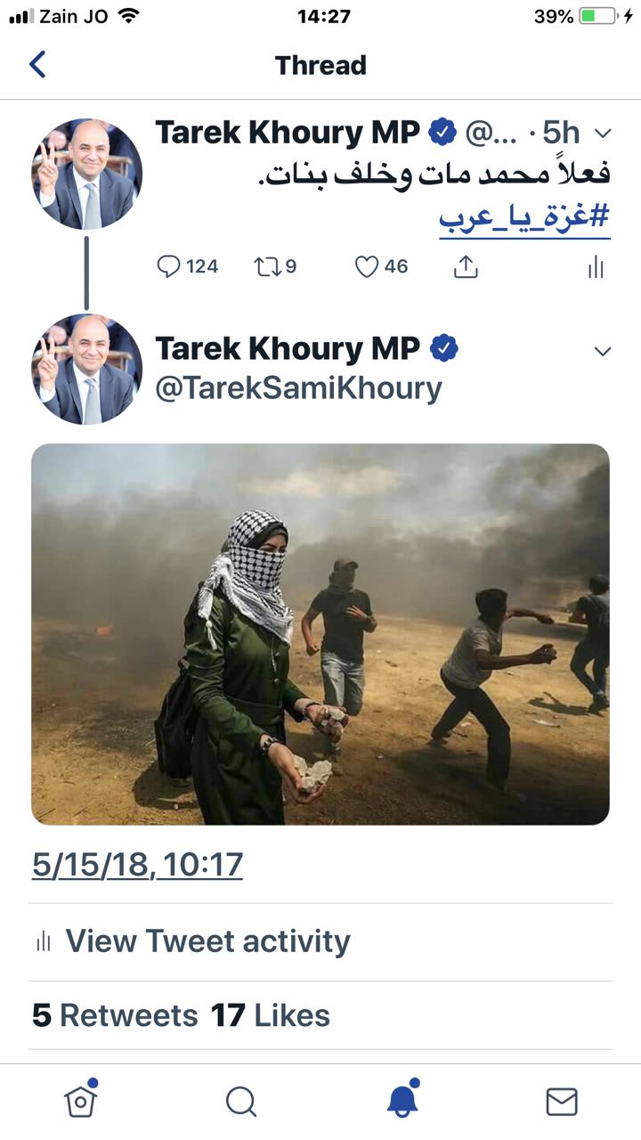 وجاء في الشكوى ان خوري نشر تغريدة على التويتر كتب فيها فعلا محمد مات وخلف بنات مع كامل تقديرنا لمرأة ولدورها في المجتمع الا ان العبارة التي كتبها النائب تشير الى انعدام الرجولة لدة امة محمد عليه الصلاة والسلام وهذا يعد ازدراء للدين الاسلامي.