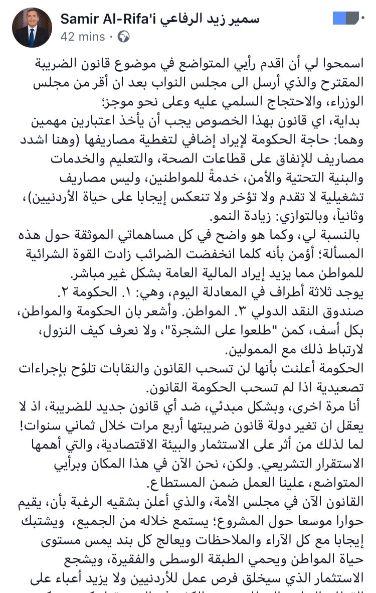 اسمحوا لي أن اقدم رأيي المتواضع في موضوع قانون الضريبة المقترح والذي أرسل الى مجلس النواب بعد ان أقر من مجلس الوزراء، والاحتجاج السلمي عليه وعلى نحو موجز؛