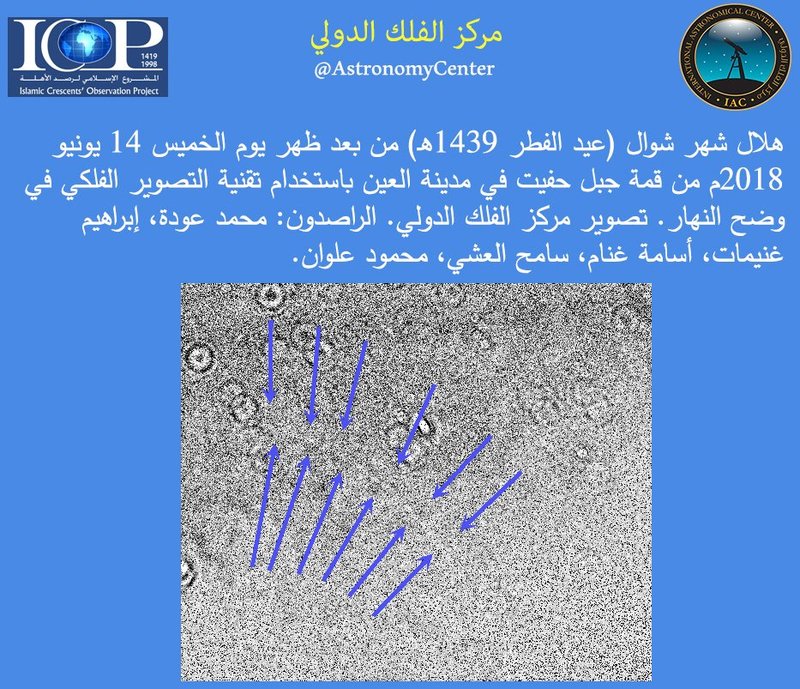 عمون - أعلن مركز الفلك الدولي،ظهر اليوم الخميس، رؤية هلال شهر شوال من قمة جبل حفيت في مدينة العين الإماراتية، باستخدام تقنية التصوير الفلكي في وضح النهار. |