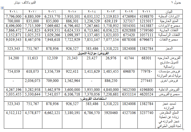 أُدرج أدناه جدولا يبين إيرادات الحكومة بما فيها المنح والمساعدات، ونفقاتها وعجز الموازنة والقروض التي حصلت عليها الحكومة وكيف استخدمتها خلال الفترة 2011-2018 .