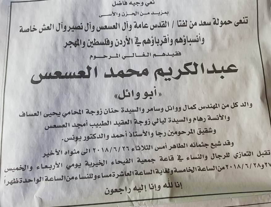 اسرة عمون تتقدم باحر مشاهر العزاء الى الاخ العزيز المحامي يحيى عساف وزوجته الفاضلة، وتتضرع للعلي القدير ان يتغمد الله الفقيد بواسع رحمته، وان يلهم ذويه الصبر والسلوان.