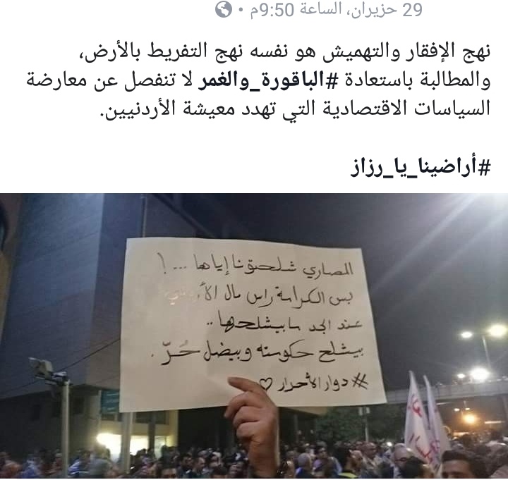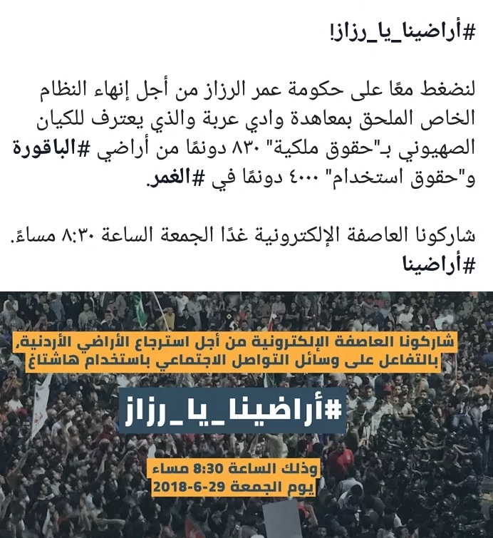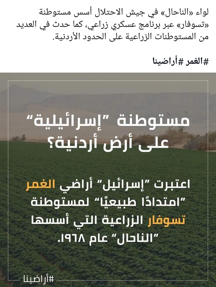 عمون - اطلق اردنيون هاشتاغ "#اراضيانا_يا_رزاز" يطالبون فيه باستعادة اراضي الباقورة والغمر من الاحتلال الاسرائيلي.