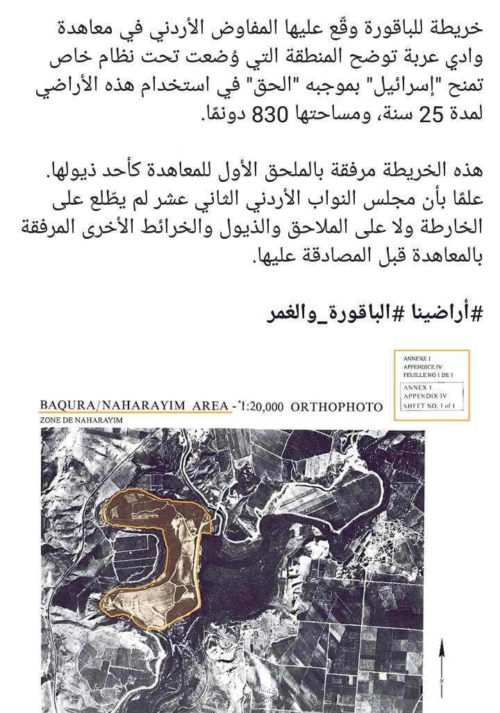 وفي حينه أكد وزير الخارجية وشؤون المغتربين أيمن الصفدي، أن أراضي الباقورة والغمر تحت السيادة الكاملة للأردن وهي ملك للخزينة الأردنية ومؤجرة للجانب الإسرائيلي لمدة 25 عاما.
