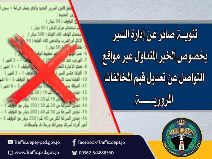 عمون - نفى مدير ادارة السير العميد زياد باكير ما يتم تداوله عبر مواقع التواصل الاجتماعي من قيم مخالفات قيل ان ادارة السير ستبدأ العمل بها، مؤكدا أن قيم مخالفات السير المتداولة غير صحيحة |