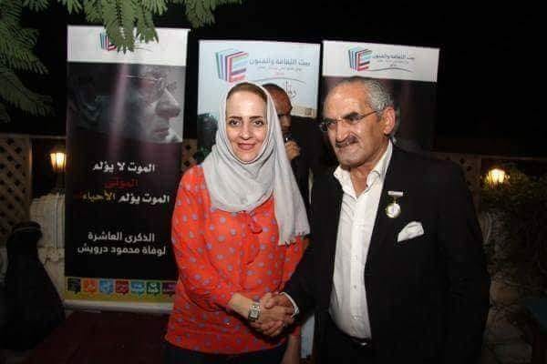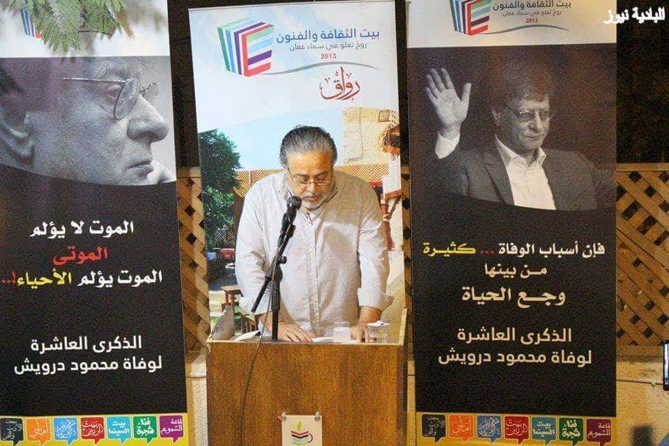عمون- احيا بيت الثقافة والفنون برئاسة الدكتورة هناء البواب رئيسة البيت في مساء يوم العاشر من هذا الشهر ذكرى رحيل الشاعر الفلسطيني الكبير محمود درويش بمشاركو مجموعة من الفنانين والكتاب منهم الفنان زهير النوباني والشعراء زهير ابو شايب ومحمد خضير ومحمد العامري وعلي الفاعوري ، وقدم الاحتفالية الشاعر احمد الدقس ذاكرا في تقديمه اهمية ما تركه درويش من موروث شعري متنوع ومهم ، حيث بدا الاحتفالية بالفنان زهير النوباني الذي قرأ مجموعة من قصائد درويش في مراحل متعددة منها بين ريتا وعيوني بندقية قال فيها :