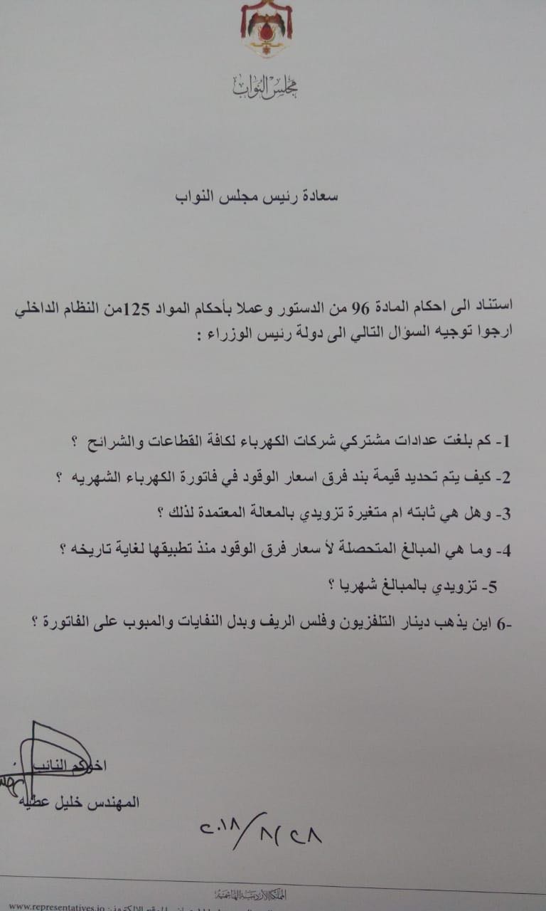 عمون - وجه النائب خليل عطية سؤالا لرئيس الوزراء حول كم بلغت عدادات مشتركي شركات الكهرباء لكافة القطاعات والشرائح. |