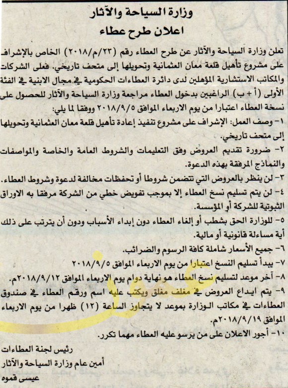 عطاء الاشراف على مشروع اعادة تأهيل قلعة معان وتحويلها الى متحف تاريخي