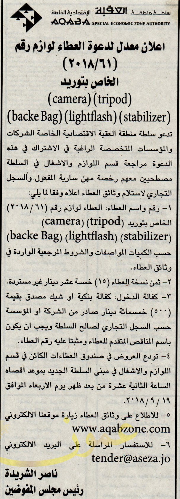 عطاء توريد( Camera )(tripod) (backe Bag)/ سلطة العقبة