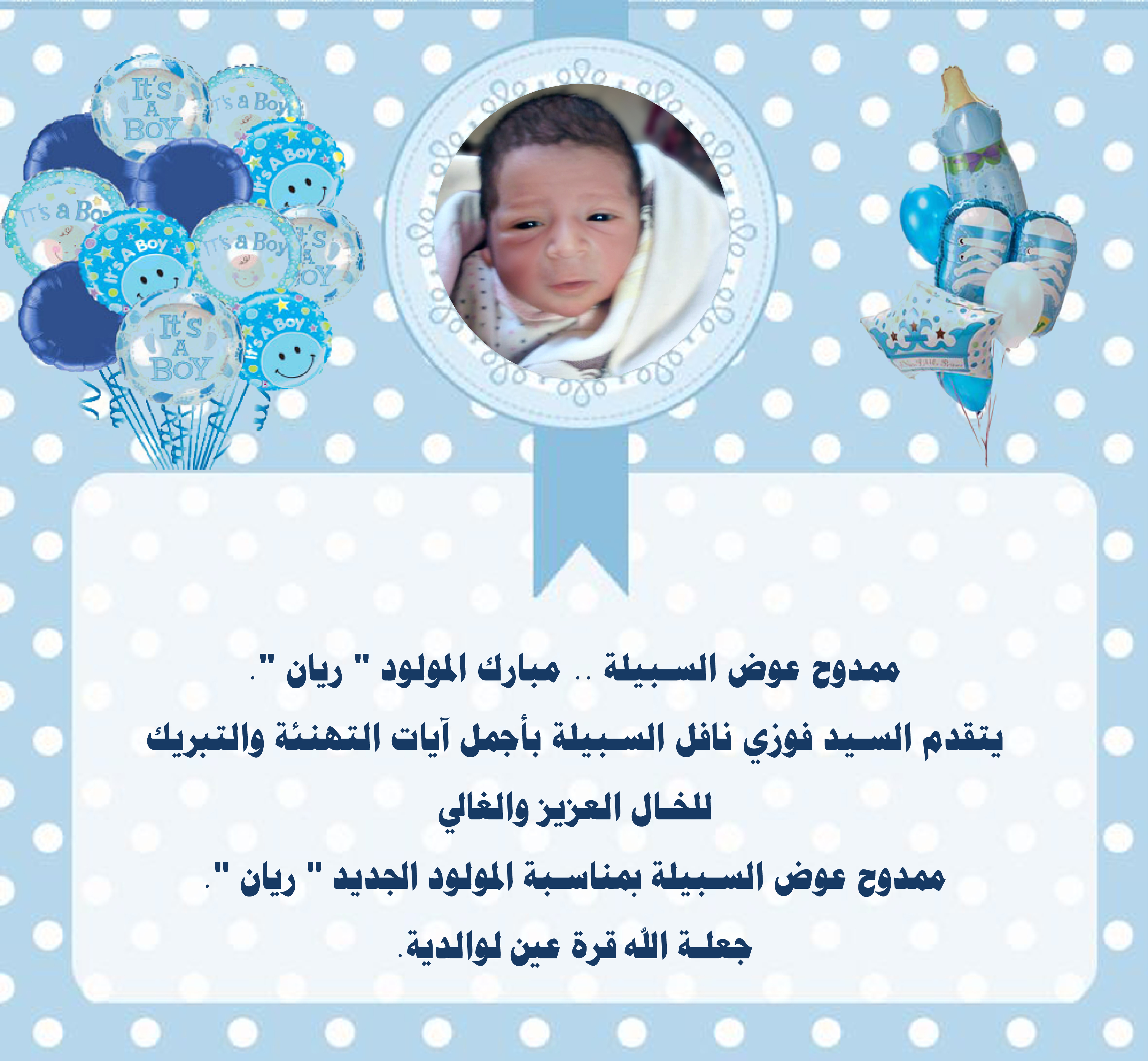 عمون- يتقدم السيد فوزي نافل السبيلة بأجمل آيات التهنئة والتبريك للخال العزيز والغالي ممدوح عوض السبيلة بمناسبة المولود الجديد "ريان".