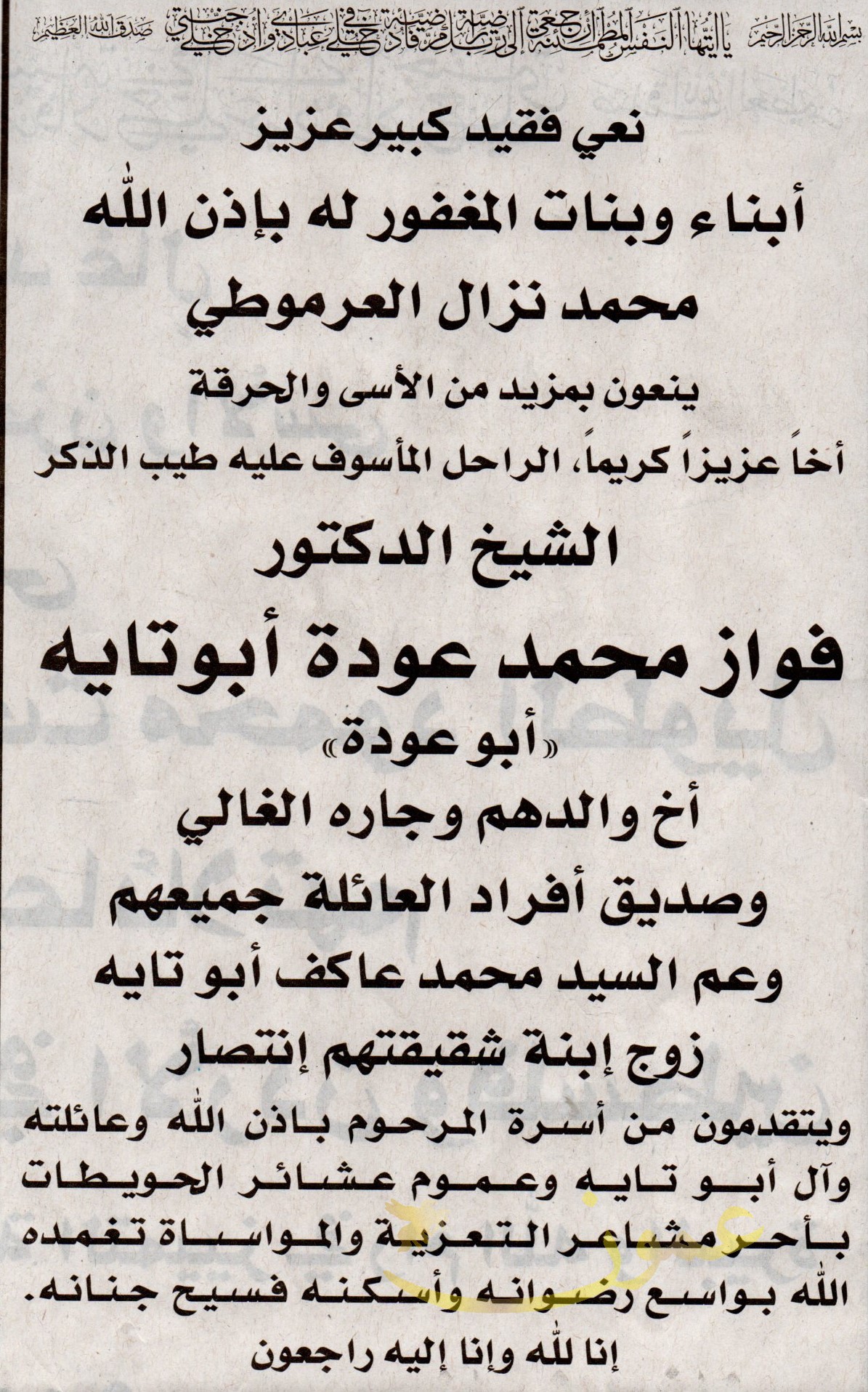 الشيخ الدكتور فواز ابو تايه في ذمة الله