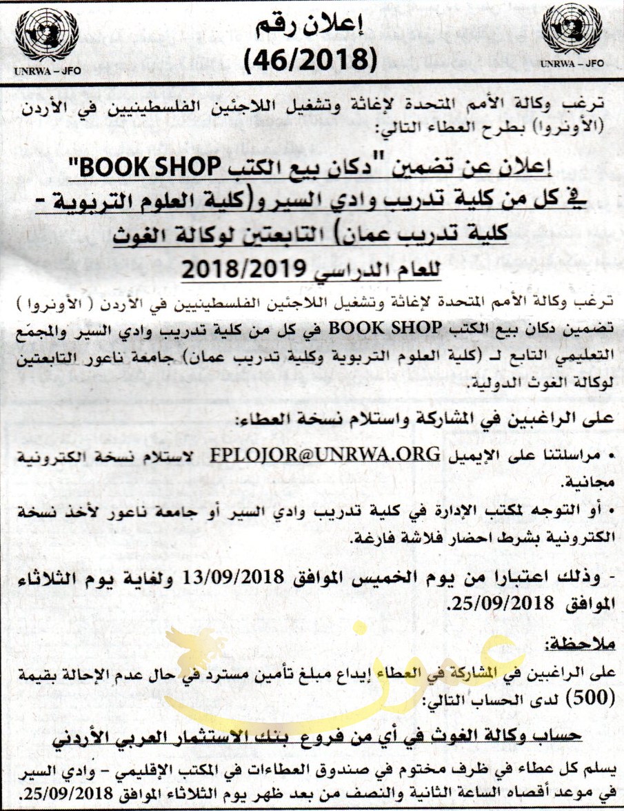 عطاء تضمين (BOOK SHOP) في كلية تدريب وادي السير/كلية العلوم التربوية /كلية تدريب عمان التابعين لوكالة الغوث / الاونروا