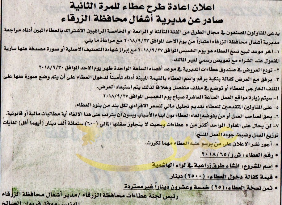 عطاء انشاء طرق زراعية في لواء الهاشمية / اشغال الزرقاء