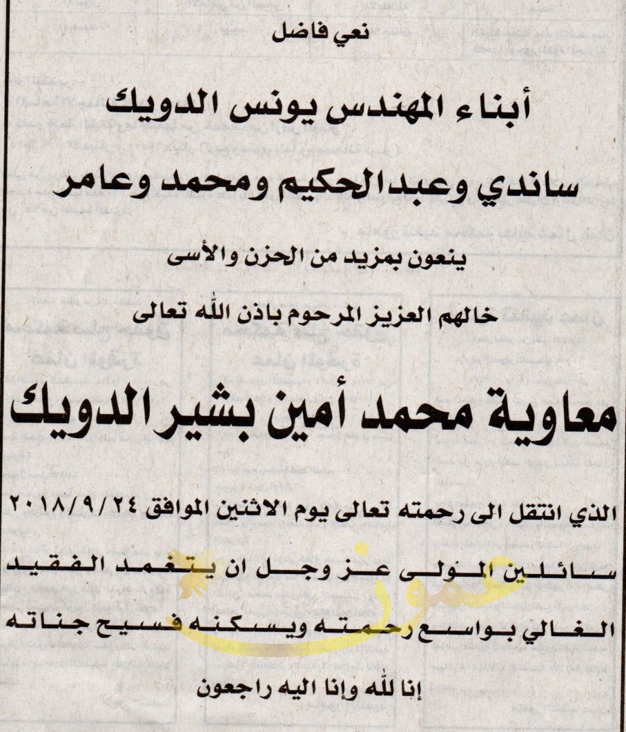 عمون- انتقل الى رحمة الله تعالى معاوية محمد أمين بشير الدويك.