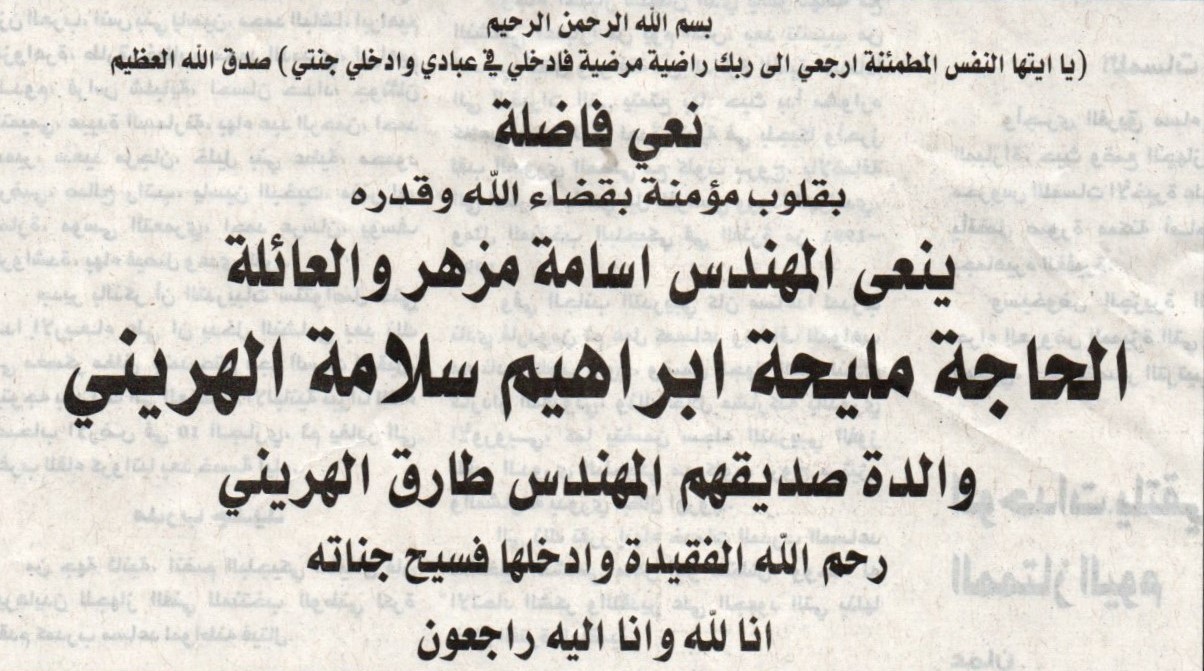 الحاجة مليحة ابراهيم الهريني في ذمة الله