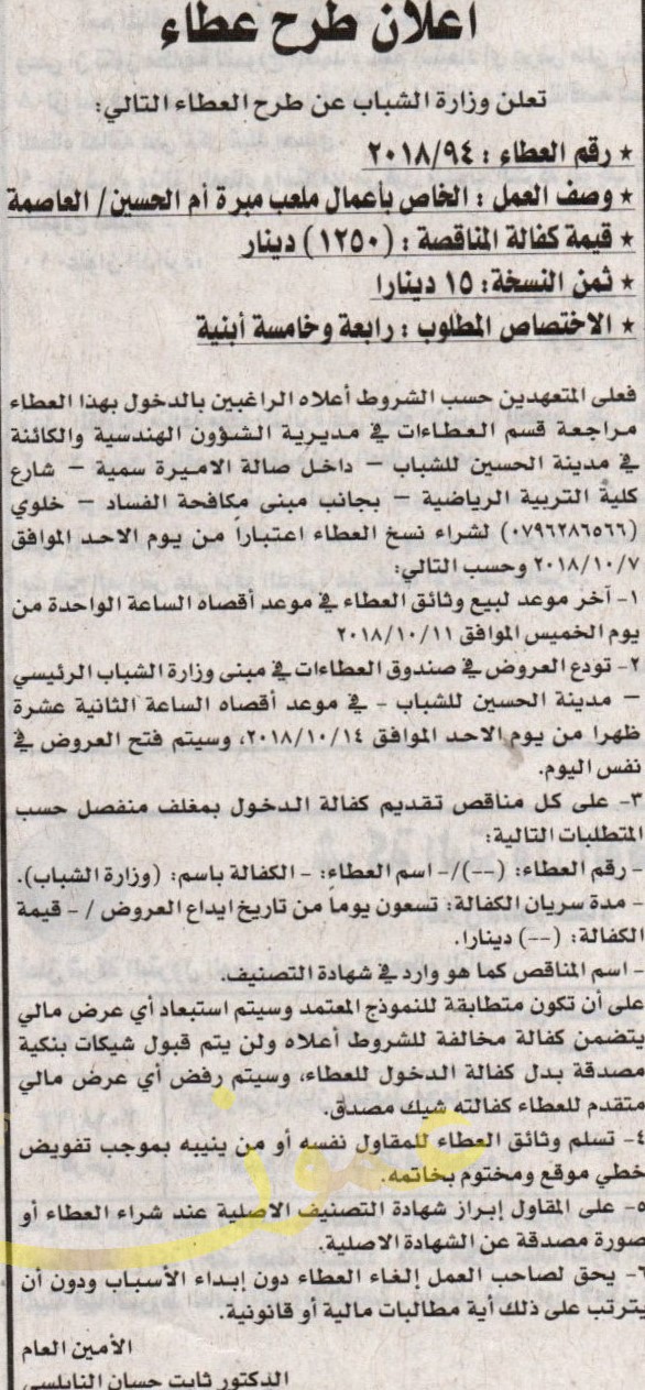 عطاء اعمال ملعب مبرة ام الحسين _ العاصمة / وزارة الشباب