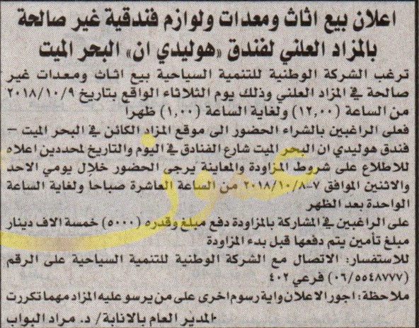 عطاء بيع اثاث ومعدات ولوازم فندقية - فندق "هوليدي ان" البحر الميت / الشركة الوطنية للتنمية السياحية