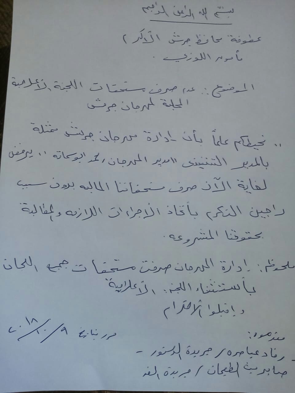 عمون - تقدم عدد من اعضاء اللجنة الاعلامية المحلية لمهرجان جرش بطلب من محافظ جرش مأمون اللوزي ورئيس مجلس محافظة جرش المحامي محمود العفيف باتخاذ الاجراءات اللازمة لتحصيل حقوقهم المالية والمترتبة على ادارة المهرجان والتي ترفض تسليمهما لاعضاء اللجنة بدون سبب. |