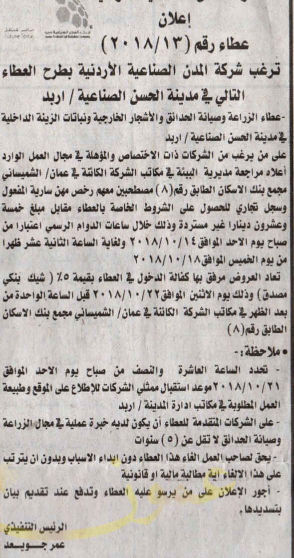 عطاء زراعة وصيانة الحدائق والاشجار ونباتات الزينة الداخلية في مدينة الحسن الصناعية - اربد