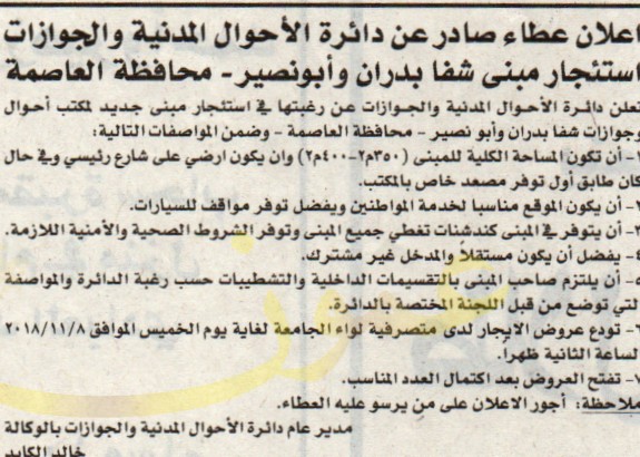 استئجار مبنى جديد لمكتب احوال وجوازات شفا بدران وابو نصير
