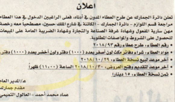 شراء دفاتر مكث لون اصفر(1000) دفتر ولون اخضر (1000) - دائرة الجمارك
