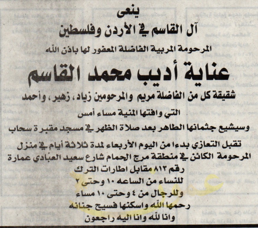 عناية أديب القاسم في ذمة الله