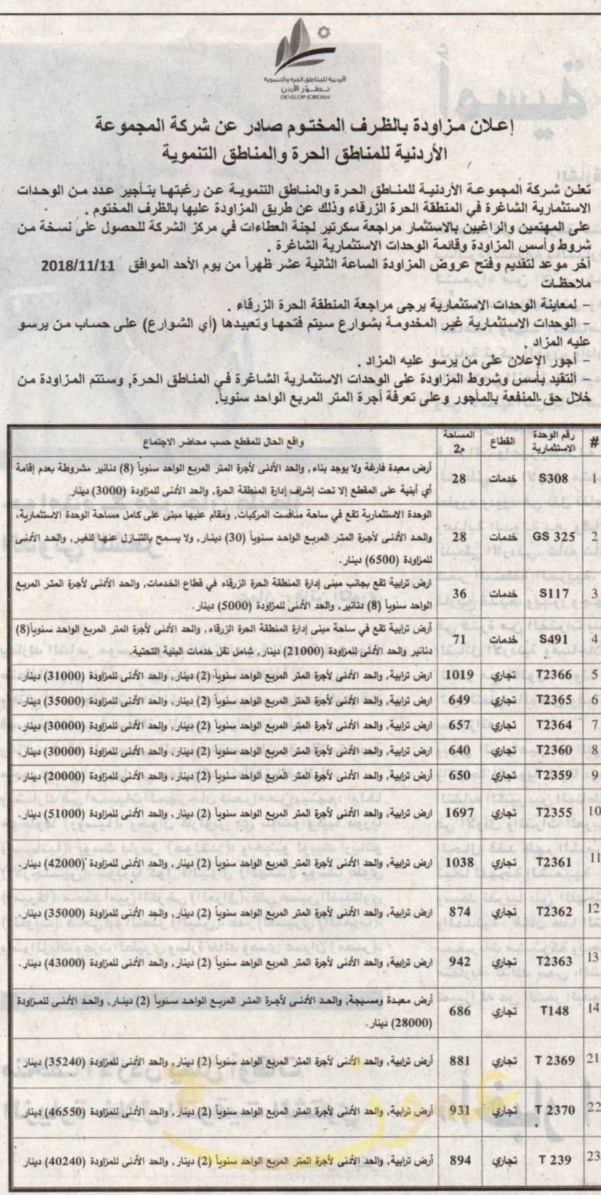 تأجير عدد من الوحدات الاستثمارية في المنطقة الحرة الزرقاء
