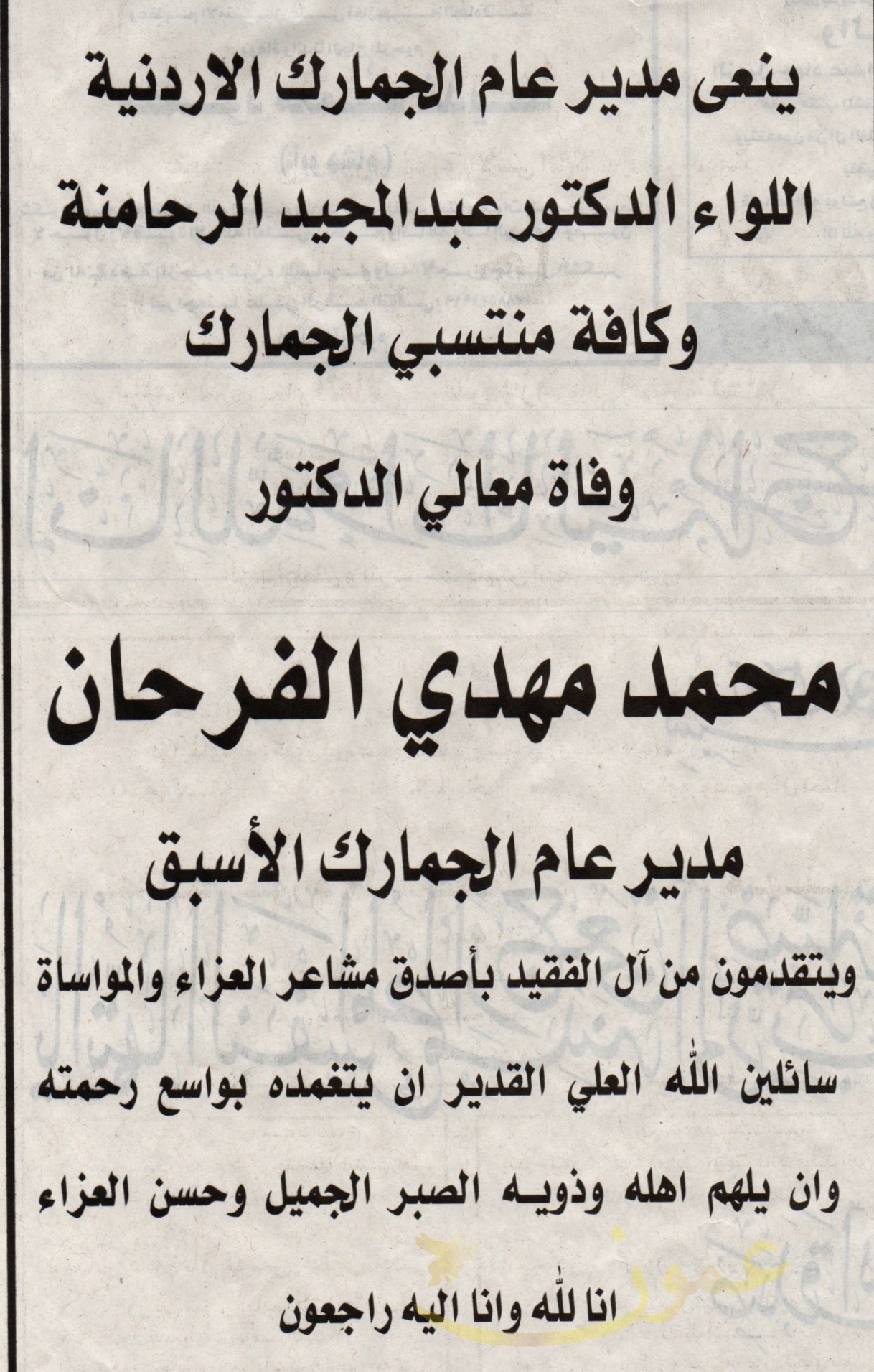 عمون- انتقل الى رحمة الله تعالى الدكتور محمد مهدي الفرحان.