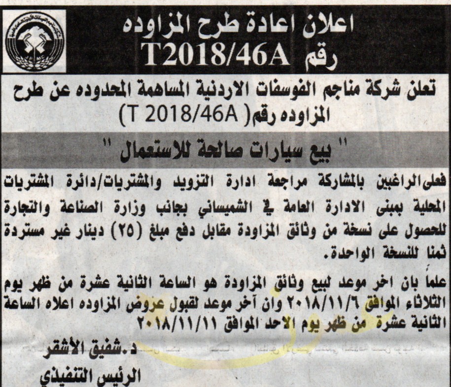 بيع سيارات صالحة للاستعمال - شركة الفوسفات