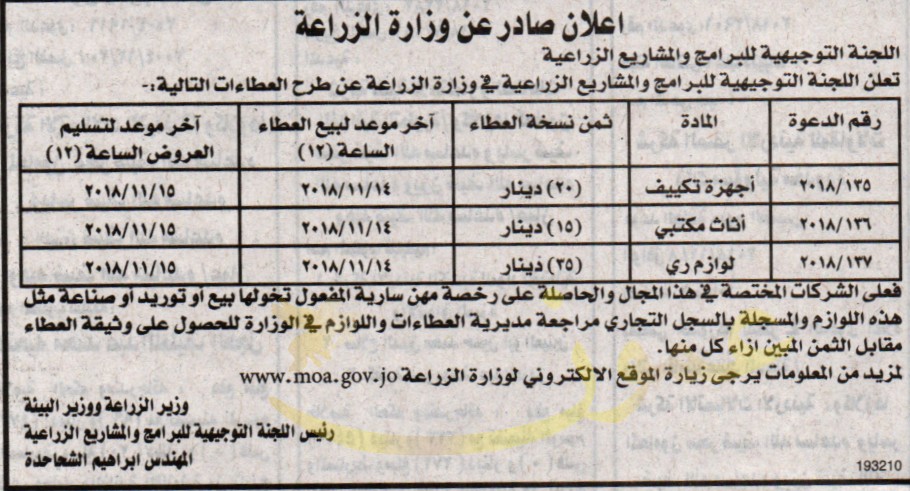 شراءاجهزة تكييف واثاث مكتبي ولوازم ري - وزارة الزراعة