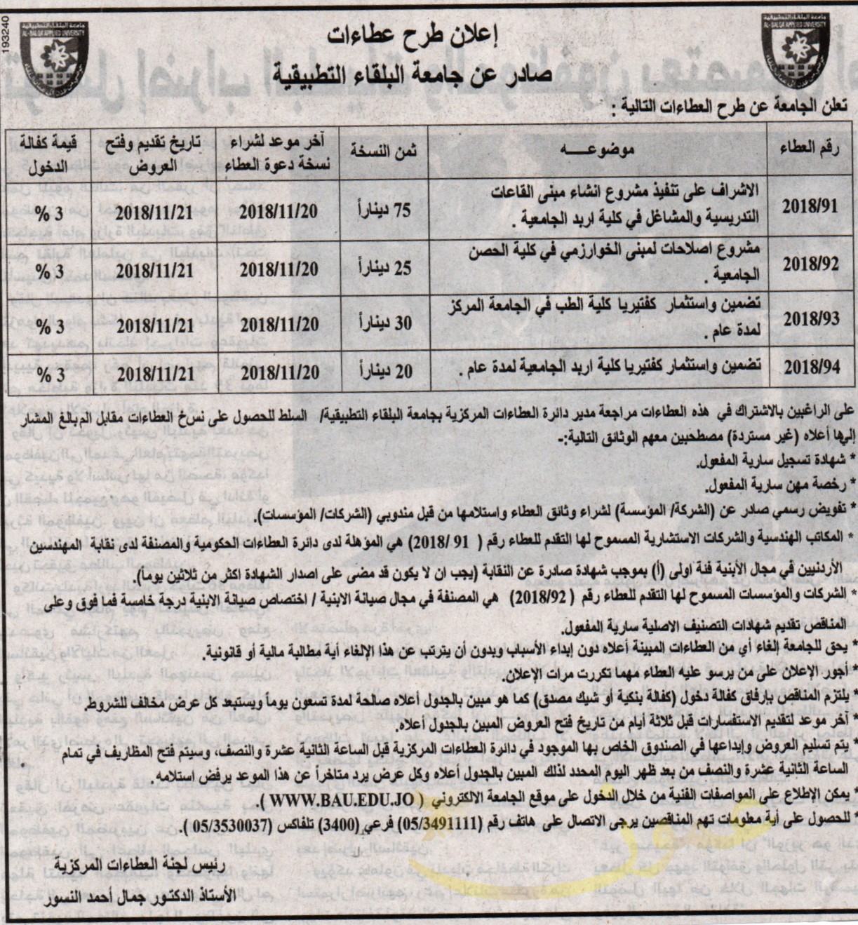عطاءات صادرة عن جامعة البلقاء التطبيقية