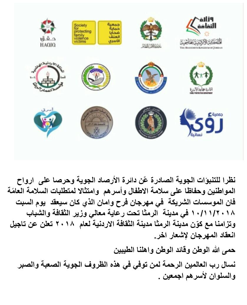 عمون- نظرا للتنبؤات الجوية الصادرة عّن دائرة الأرصاد الجوية وحرصا على ارواح المواطنين وحفاظا على سلامة الاطفال وأسرهم وامتثالا لمتطلبات السلامة العامًة فان الموسسات الشريكة في مهرجان فرح وامان الذي كان سيعقد يوم السبت ٢٠١٨/١١/١٠ في مدينة الرمثا تحت رعاية وزير الثقافة والشباب وتزامنا مع كوّن مدينة الرمثا مدينة الثقافة الاردنية لعام ٢٠١٨ تعلن عن تاجيل انعقاد المهرجان لإشعار اخر. |