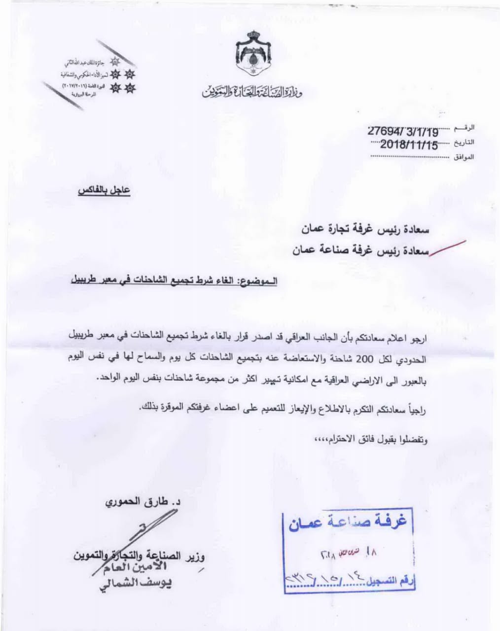 إلغاء شرط تجميع الشاحنات الأردنية في معبر طريبيل18-11-2018 02:05 PM
