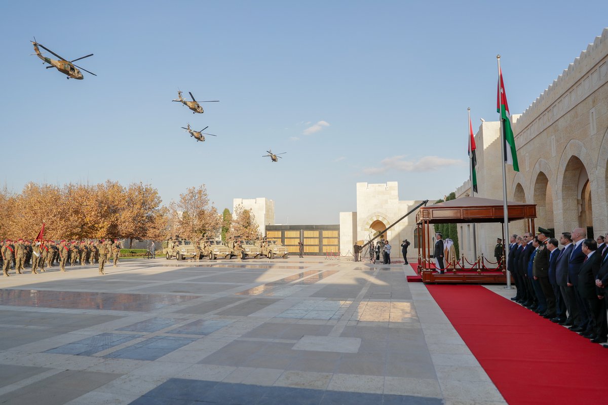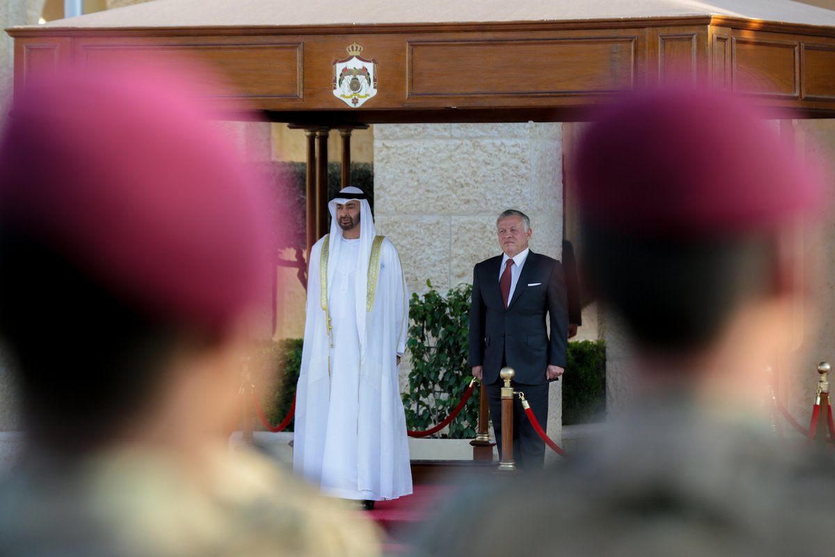 عمون - حضر جلالة الملك عبدالله الثاني، القائد الأعلى للقوات المسلحة، وسمو الشيخ محمد بن زايد آل نهيان ولي عهد أبوظبي، نائب القائد الأعلى للقوات المسلحة في دولة الإمارات العربية المتحدة، مراسم إطلاق اسم لواء سمو الشيخ محمد بن زايد آل نهيان/التدخل السريع على لواء التدخل السريع/عالي الجاهزية، التي جرت في قصر الحسينية اليوم الثلاثاء.