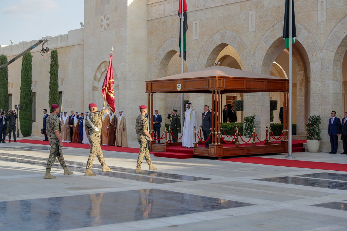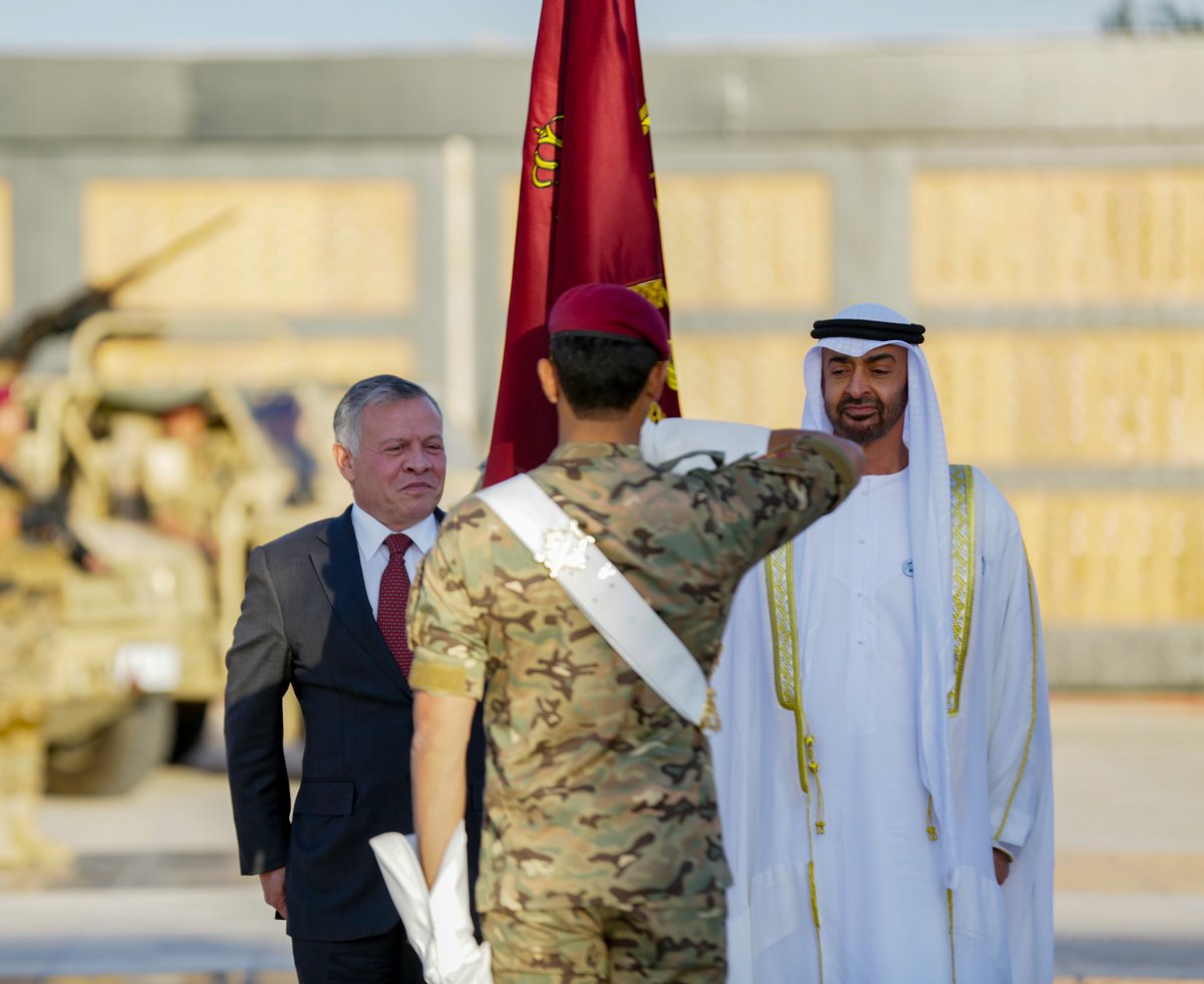وسلم جلالة الملك وسمو الشيخ محمد بن زايد آل نهيان علم اللواء بالشارة والاسم الجديدين لحملة الأعلام من مرتبات اللواء، ضمن مراسم عسكرية بدأت بعزف السلام الوطني لدولة الإمارات العربية المتحدة، والسلام الملكي الأردني.