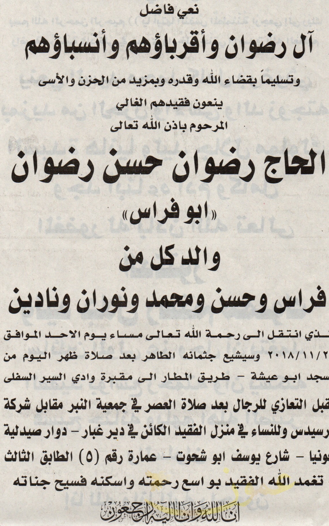 عمون- انتقل الى رحمة الله تعالى الحاج رضوان حسن رضوان "ابو فراس"