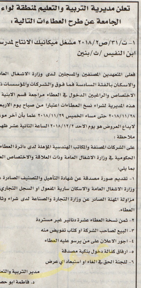 انشاء مشغل ميكانيك الانتاج لمدرسة ابن النفيس - مديرية تربية وتعليم لواء الجامعة