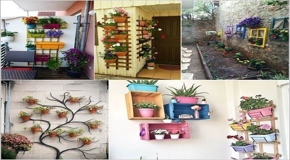 2- عرض أصص النباتات والأزهار على ألواح من الخشب بشكل متدرج.