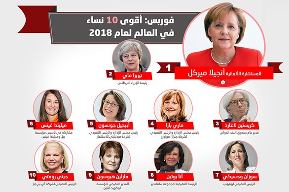 ووفقاً لمجلة "فوربس" الأمريكية، تمثل النساء الآن ما يقارب 20٪ من المقاعد الرئاسية والحكومية والبرلمانية في جميع أنحاء العالم، ونستعرض هنا قائمة الـ10نساء الأقوى والأكثر تأثيراً في العالم لعام 2018، وفق آخر تصنيف لـ "فوربس":