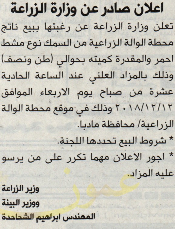 بيع ناتج محطة الوالة الزراعية من السمك - وزارة الزراعة
