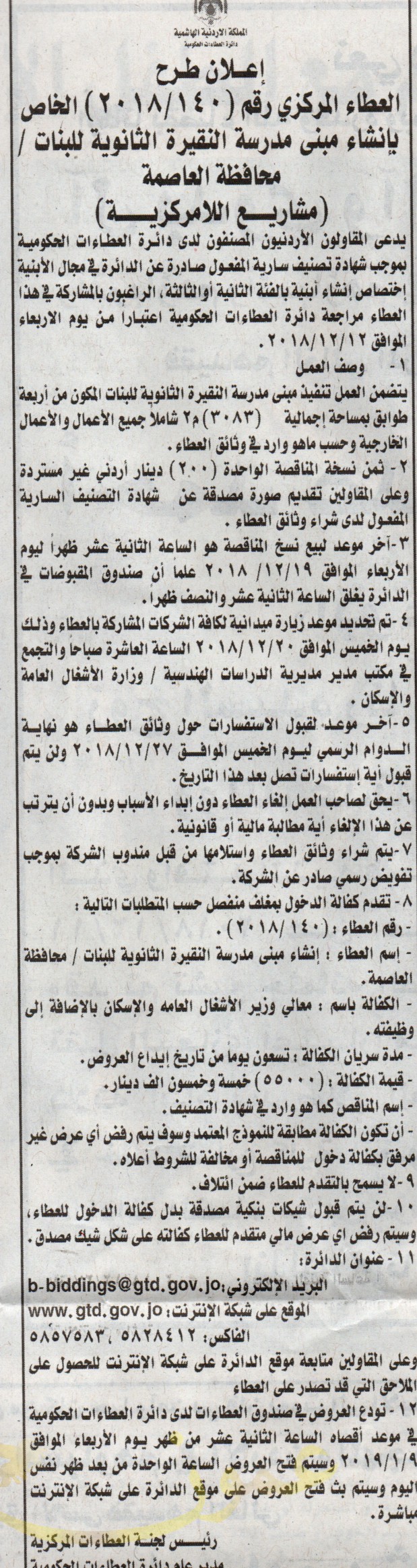 انشاء مبنى مدرسة النقيرة الثانوية للبنات - عمان - دائرة العطاءات الحكومية